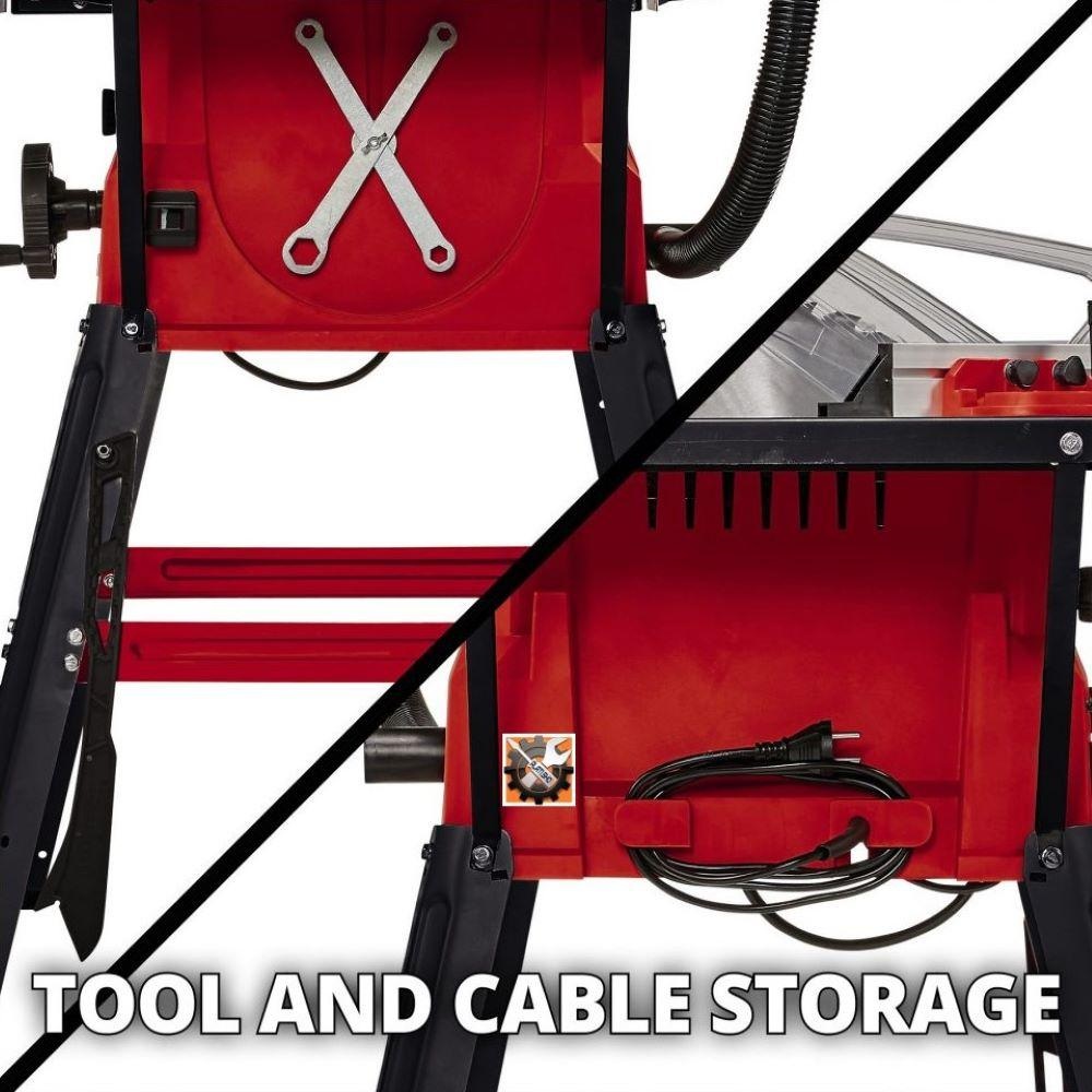 Držač pribora osigurava siguran transport i skladištenje - klizna kolica i alati za promjenu lista pile dobro su pospremljeni. Kako bi se spriječio kaos oko kabela, u uređaj je integriran namotač kabela.