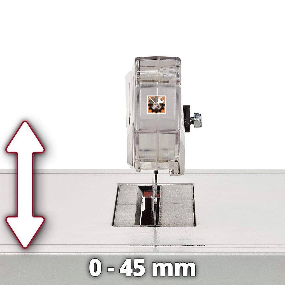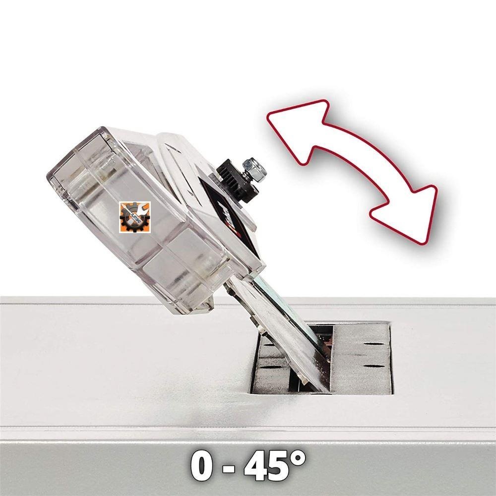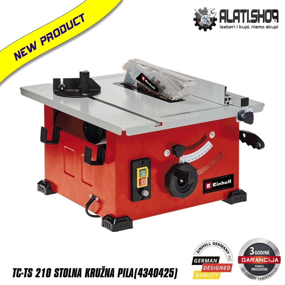 Einhell stolna kružna pila TC-TS 210 je višenamjenski stolni cirkular namijenjen ambicioznim „uradi sam“ majstorima za rezanje svih vrsta drva, drvnih materijala, furnira i sl. Pila je opremljena jakim motorom maksimalne snage od 900 W / 1200 W | 40 % i 4800 okretaja u minuti. Rezni list se može zakretati sve do 45° za kosi rez. Veličina radnog stola od 525 x 440 mm pruža otimalan prostor za rad. Zahvaljujući kompaktnoj konstrukciji, cirkular je idealan za prijenosnu upotrebu. Pila je opremljena dodatnim sigurnosnim štapom za guranje radnog materijala, a dodatna zaštita je osigurana zahvaljujući dodatnoj zaštiti motora od preoptrećenja. Plastične noge na metalnom kućištu osiguravaju potrebnu stabilnost.
