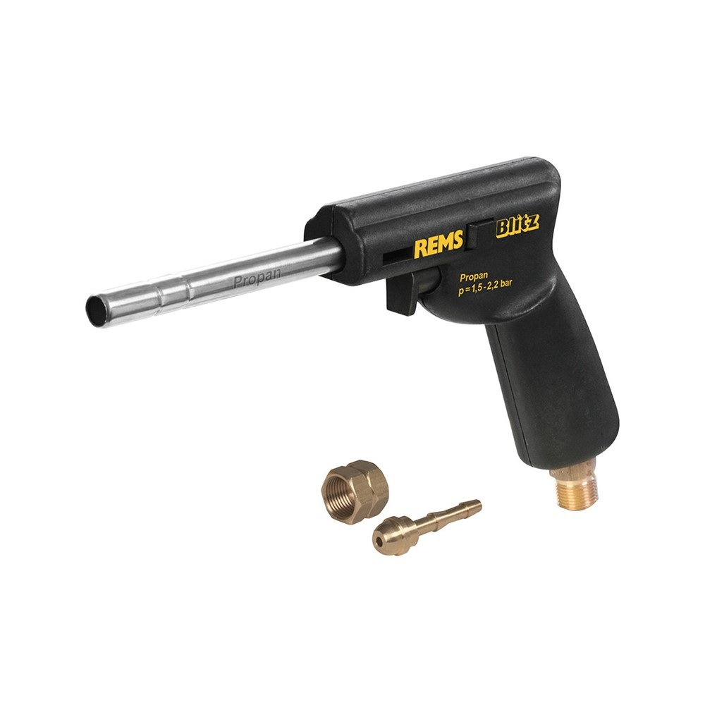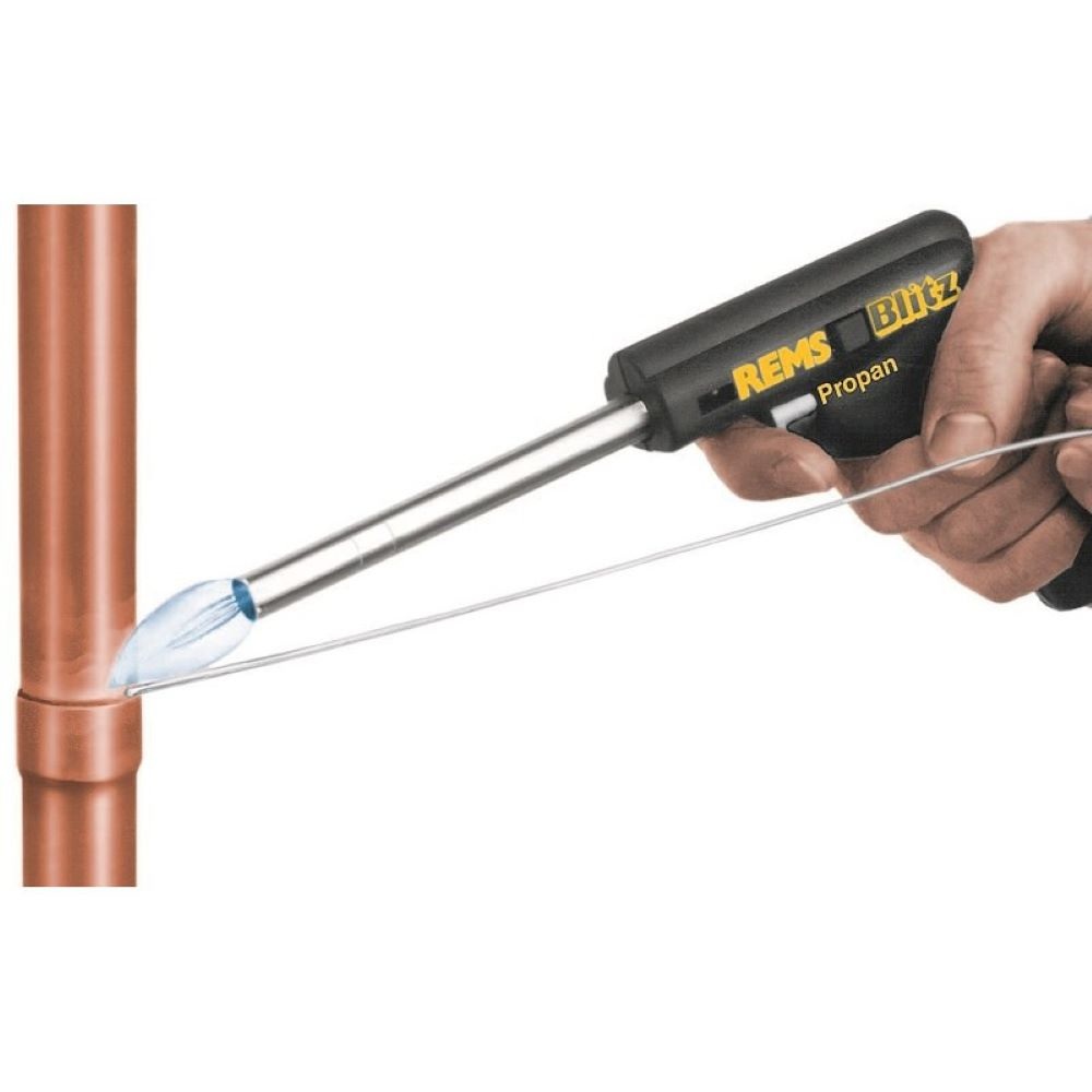 REMS Blitz – Meko lemljenje brzo poput munje! Piezo-električno samopaljenje, bez upaljača. Smanjena potrošnja plina, samo 160 g/h. Precizan plamen sa Turbo-drall pojačalom za visoku snagu zagrijavanja i brzo lemljenje. Bez podešavanja i regulacije. Jednostavno rukovanje sa jednom rukom. Prekidač za trajni rad. Samo 1 univerzalna cijev plamenika.