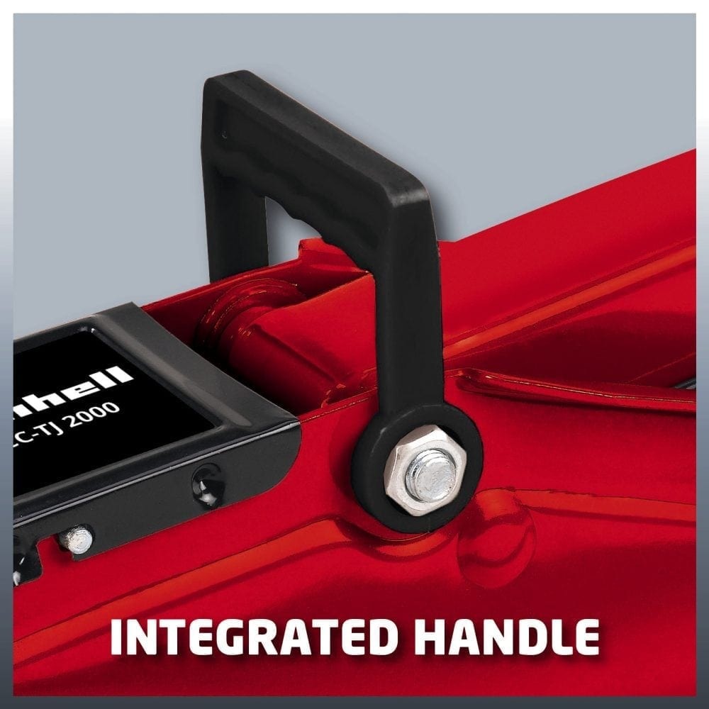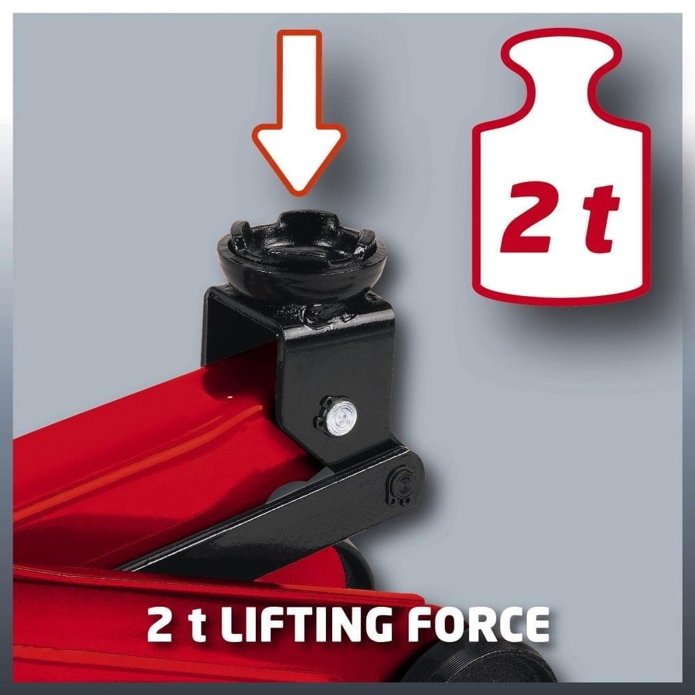 Einhell hidraulična dizalica CC-TJ 2000 je stabilna i mobilna dizalica za automobile s 2 tone nosivosti. S visinom podizanja od 33 cm ova dizalica je velika pomoć kod raznih poslova u garaži ili radionici. Za veću sigurnost zaslužan je podmetač za podizanje i poluga za podizanje. Integrirani sigurnosni ventil spriječava nastanak šteta kod preopterećenja. 2 kotača s kugličnim ležajima pružaju jednostavan manevar s dizalicom, a dizalica se i vrlo jednostavno može transportirati zahvaljujući praktičnoj ručki.
