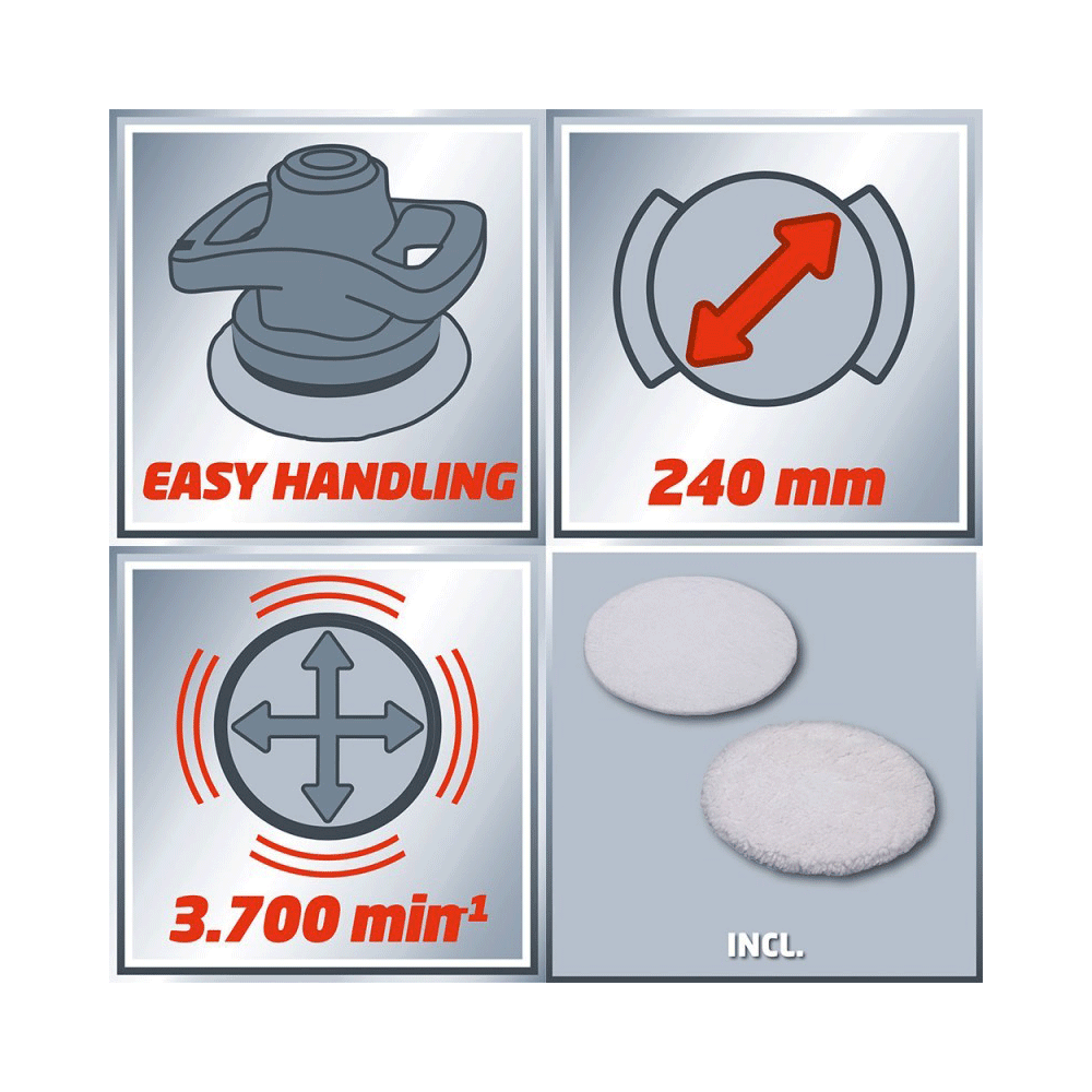 Einhell CC-PO 90 je praktičan i robustan uređaj za jednostavno poliranje obojenih lakiranih površina sa diskom za poliranje promjera 240 mm i 3.700 o/min. Sredstvo za poliranje se nanosi na površinu sa tekstilnom navlakom za poliranje, a sintetička navlaka služi za stvaranje dugotrajnog sjaja.