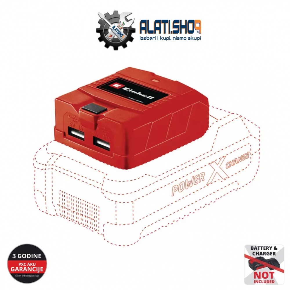 Einhell USB prijenosni punjač TC-CP 18 Li USB-Solo je praktični i mobilni izvor energije za punjenje mobilnih telefona, tableta, Mp3 playera i mnogih drugih manjih potrošača energije koji se koriste dok ste u pokretu. Izvor snage dolazi iz inovativnog sistema Power X- Change koji donosi dovoljno energije za Vaše uređaje u bilo kojem trenutku. Punjač ima 2 USB porta tako da se 2 uređaja mogu puniti istovremeno. Za brzo punjenje jedan USB port ima snažnu 2.1 A struju punjenja. Isporuka je bez baterije i punjača (dostupni zasebno).