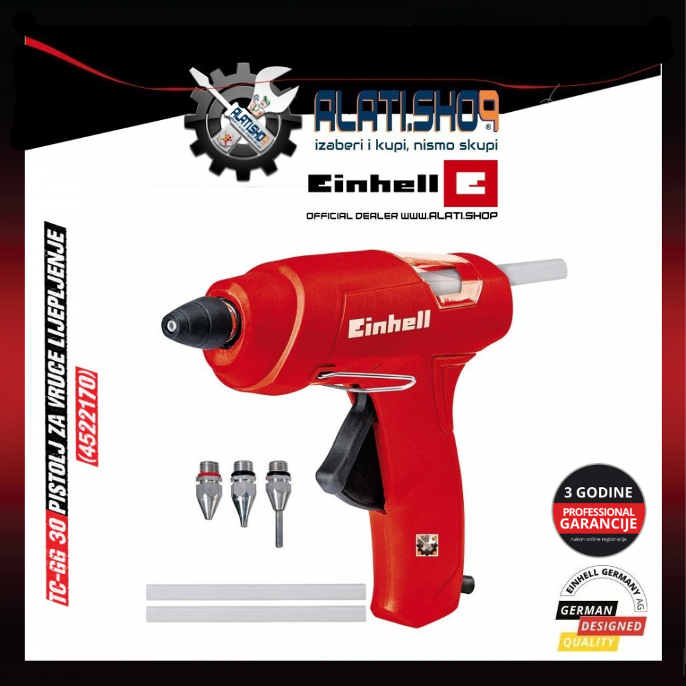 Univerzalni pištolj za vruće ljepljenje namijenjen za brzo i jednostavno spajanje drva, plastike, tekstila, kartona, keramike, kože i dr. TC-GG 30 služi kreativnim majstorima za vlastite projekte, ali također može pružiti brzu i učinkovitu pomoć kada dođe do manjih nezgoda. Ovaj pištolj za vruće ljepilo ima funkciju mehaničkog uvlačenja patrona za selektivnu primjenu te mali s prozorčić za promatranje koji će vam pomoći u radu. Ergonomska ručka omogućava neumorni rad čak i tijekom dugotrajnih projekata. Nastavak za odlaganje omogućava pohranu bez problema. U kompletu dolazi sa standardnom mlaznicom, ravnom mlaznicom, produženom mlaznicom i 3 komada patrona.