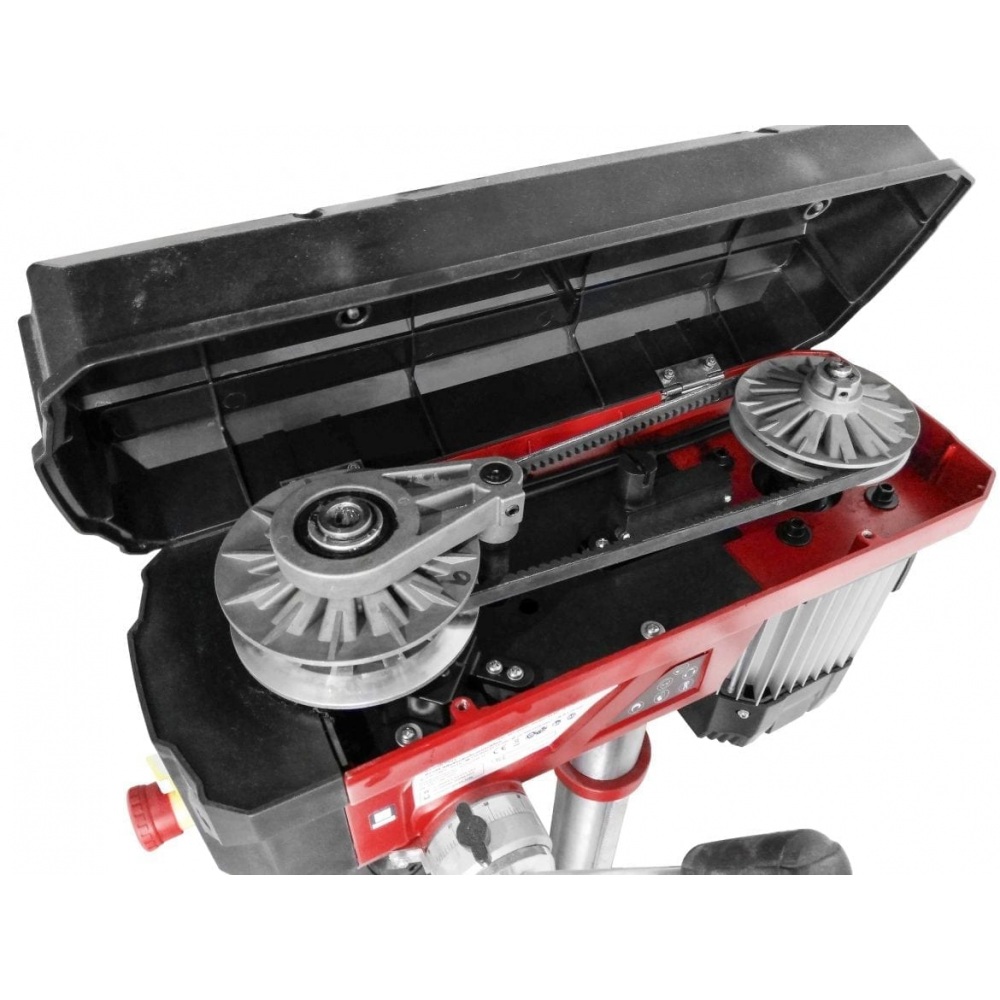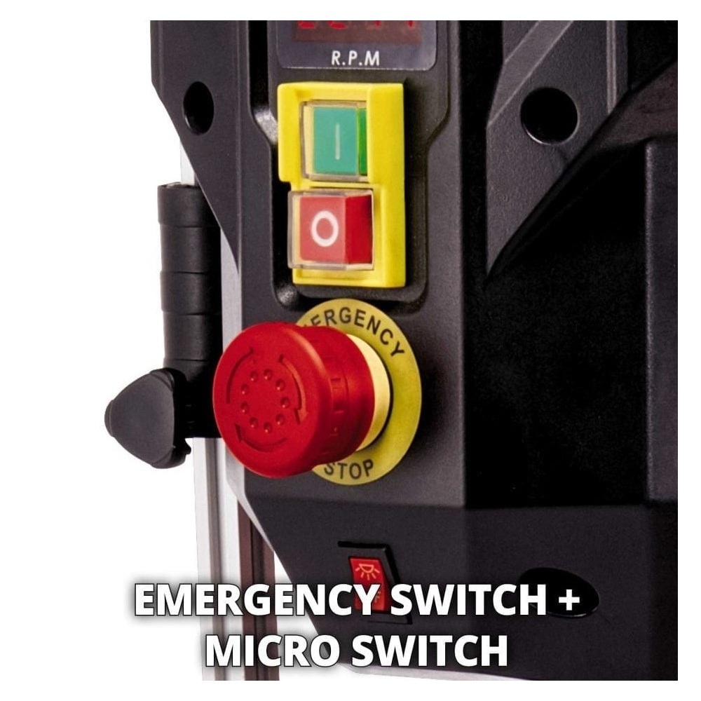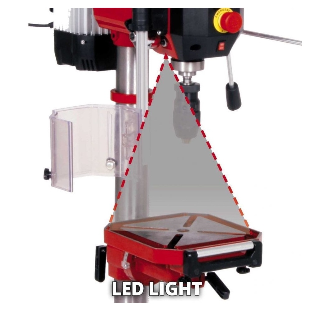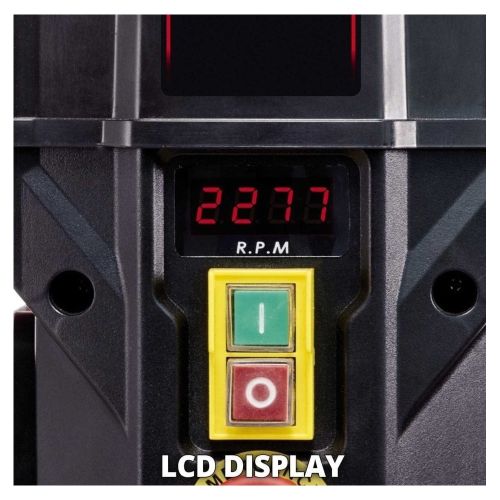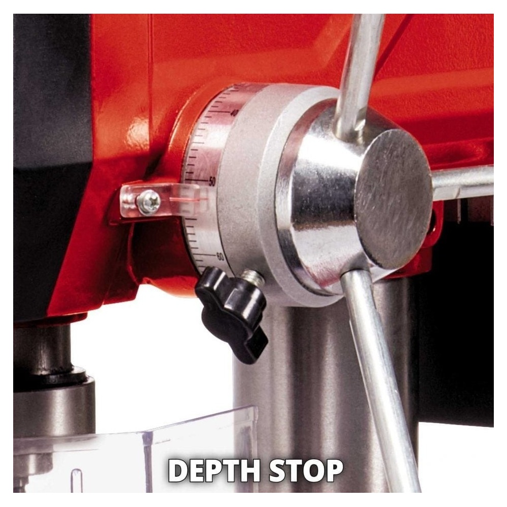 Einhell stupna bušilica TE-BD 750 E je snažan precizni alat bez kojega ne bi smijela biti niti jedna radionica. Ima maksimalnu snagu od 750 W za kontroliranje brzine osovine od 450 do 2500 okr/min. Brzina je beskonačno podesiva i nema potrebe za dodatnim alatom. Trenutna brzina prikazuje se na LCD zaslonu. Ugodno korištenje osigurano je uglađenim i tihim indukcijskim motorom. Za prihvat svih bitova standardne veličine, brzostezna glava ima raspon od 1 do 16 milimetara. Uz to, Einhell stupna bušilica TE-BD 750 ima MK2 steznu glavu za Morse konusne bitove. Optimalni uvjeti za sve željene poslove bušenja osigurani su radnim stolom bušilice s mogućnošću podešavanja visine i funkcijama nagiba i zakretanja, koji također ima elemente za povećanje širine. LED svijetlo osvjetljava radni stol bušilice za optimalni radni učinak. Osovina bušilice ima kuglične ležajeve koji osiguravaju dugotrajni životni vijek. Dodatna sigurnost je pružena pomoću sigurnosne sklopke za isključivanje i sigurnosne zaštite osovine. Dohvat stupne bušilice je 152 milimetra i maksimalna dubina bušenja 80 milimetara.