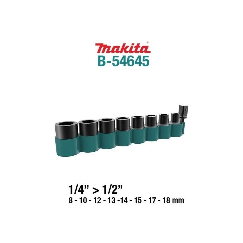 Makita B-54645 set nasadnih ključeva - gedora 1/2 " veličine 8 mm, 10 mm, 12 mm, 13 mm, 14 mm, 15 mm, 17 mm i 18 mm plus gumeni držač gedora i adapter od 1/4" do 1/2"