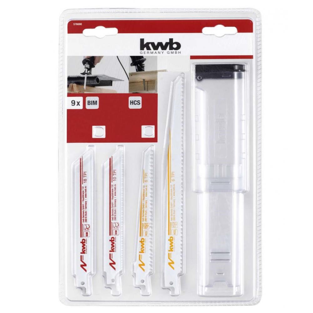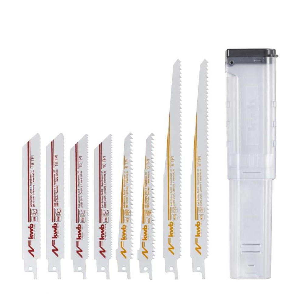 9 dijelni set listova sabljaste pile za drvo i metal, u praktičnoj kutiji za odlaganje. 4 lista sabljaste pile sa grubim zubima za drvo, ugljični čelik HCS, kaljeni, precizno brušeni i postavljeni zubi, od kojih 2 duljine 150 mm i 2 duljine 228 mm. 4 lista pile za metal duljine po 115 mm, 2 gruba i 2 fino nazubljena. Dvometalni, otvrdnuti, postavljeni zubi, glodani, metalni listovi pile.