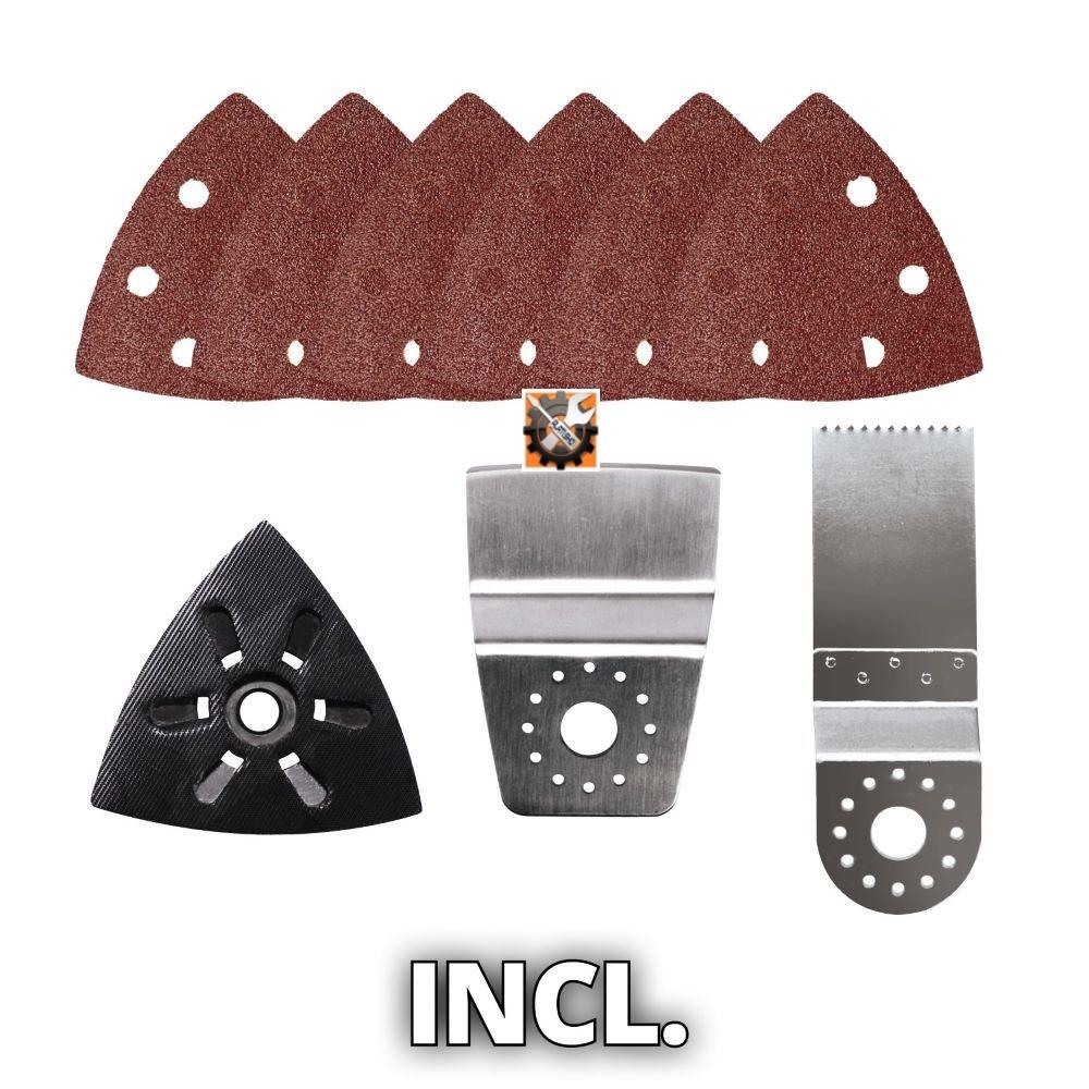 | Isporučeni pribor | Delta brusnu ploču za brušenje, 6 listova brusnog papira (3 x P60 / 3 x P120), jedno strugalo, jedan rezni list pile za drvo i plastiku, adapter za uklanjanje prašine i šesterokutni ključ |