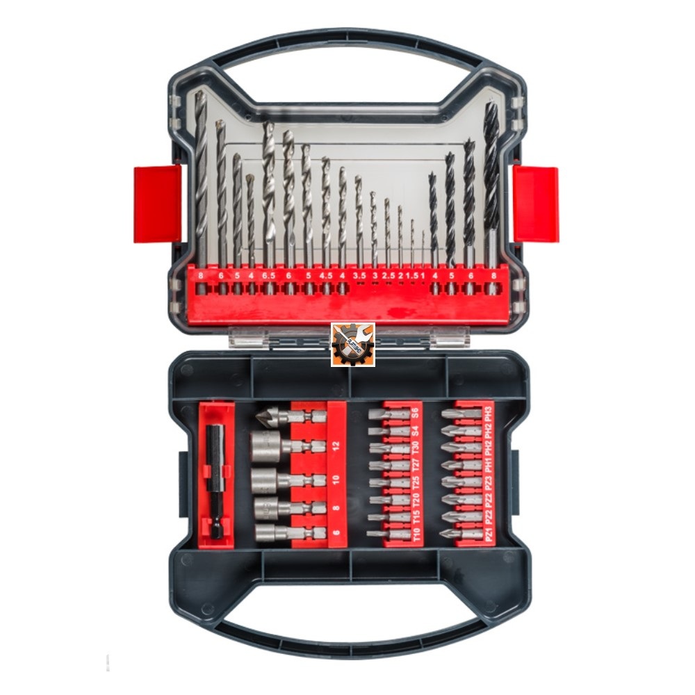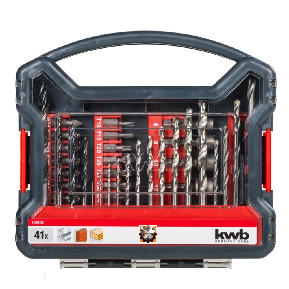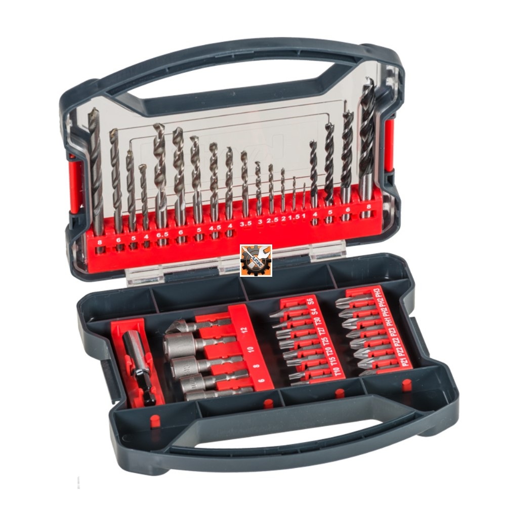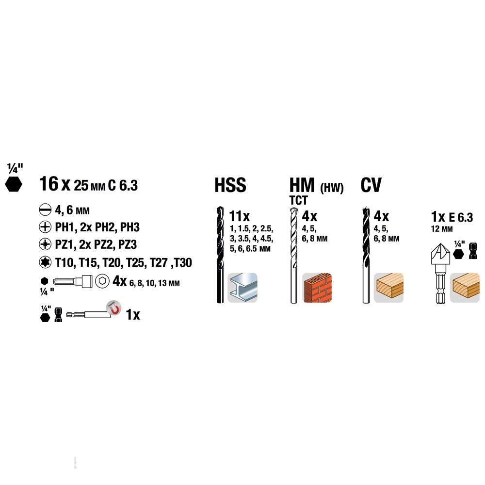 U izdržljivoj plastičnoj kutiji sa sigurnim zatvaračem i integriranom ručkom. Optimalna integracija za sve aku i električne odvijače i bušilice. Širok raspon svrdla za drvo, metal i kamen, nasadni ključevi, asortiman bitova u standardnim veličinama za brzo umetanje u stroj. Brza zamjena bita s isporučenim držačem za bit, uključujući i svrdlo za rad u mekom drvetu pri maloj brzini. Svi bitovi i držači za bit su izrađeni od visokokvalitetnog kromiranog vanadijum čelika