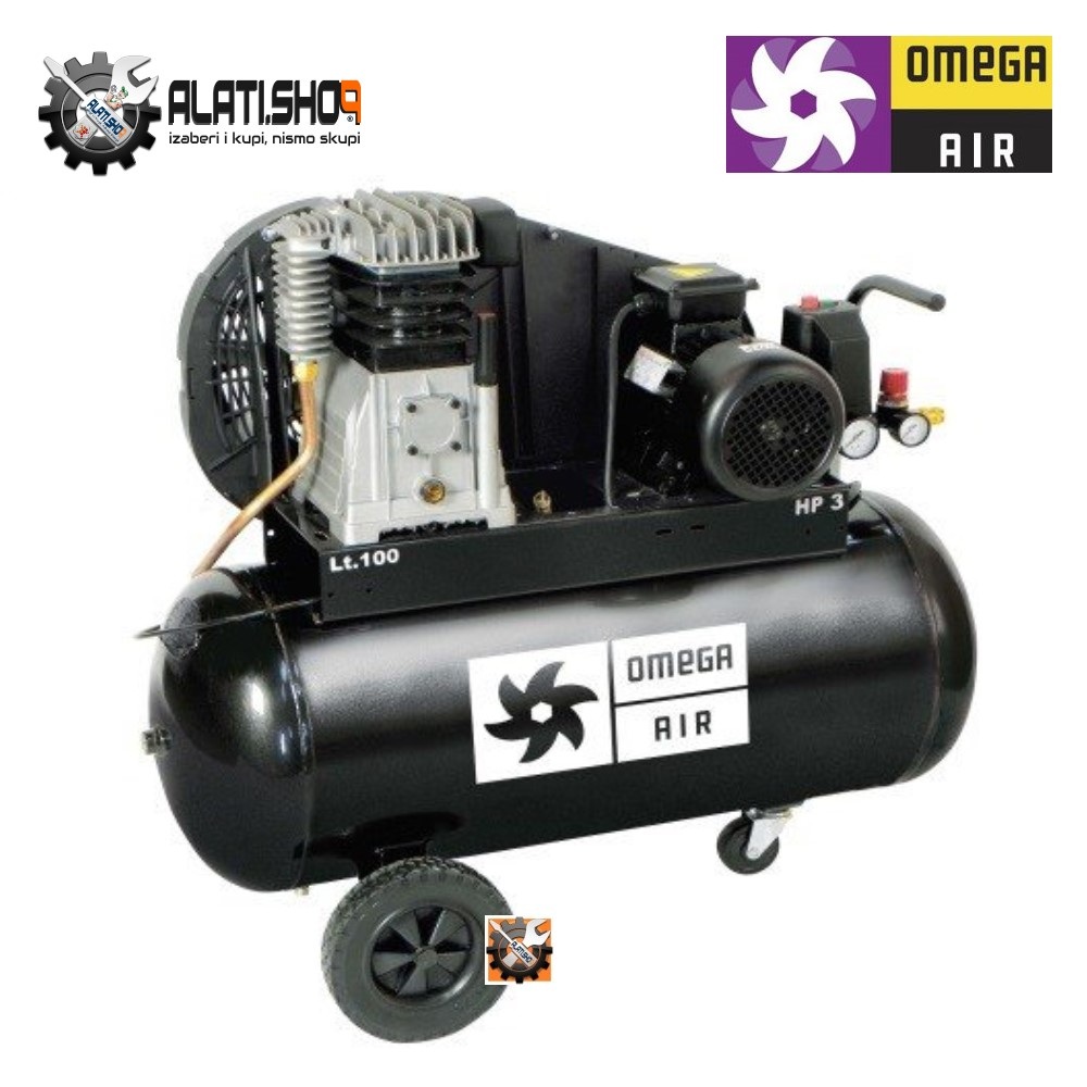 Zračni kompresor Omega JPN 350/90 s pritiskom do 10 bara ima prostorni kapacitet od 100 litara.