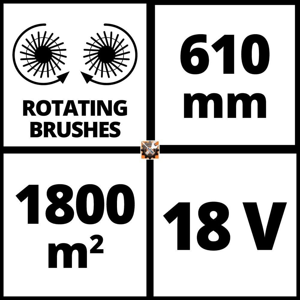 Einhell TE-SW 18/610 Li-Solo aku mehanički čistač član je fleksibilne PXC obitelji. Baterija i punjač dostupni su zasebno. Ovaj uređaj treba jednu punjivu bateriju od 18 V. Mehanički uređaj za čišćenje pomaže u radu kod čišćenja, omogućujući vam metenje bez naprezanja koristeći pogon i motor potpomognut baterijom, do samih rubova zahvaljujući četkici sa strane. Odličan je za čišćenje velikih površina do 1800 m2 na sat zahvaljujući širini od 610 mm što olakšava održavanje velikih dvorišta urednima. Prekidač za uključivanje i isključivanje nalazi se na samoj ručici. Za lako rukovanje ima velike okretne valjke i ergonomski oblik. Zajedno s 20-litarskim spremnikom za prljavštinu koji se može odložiti.