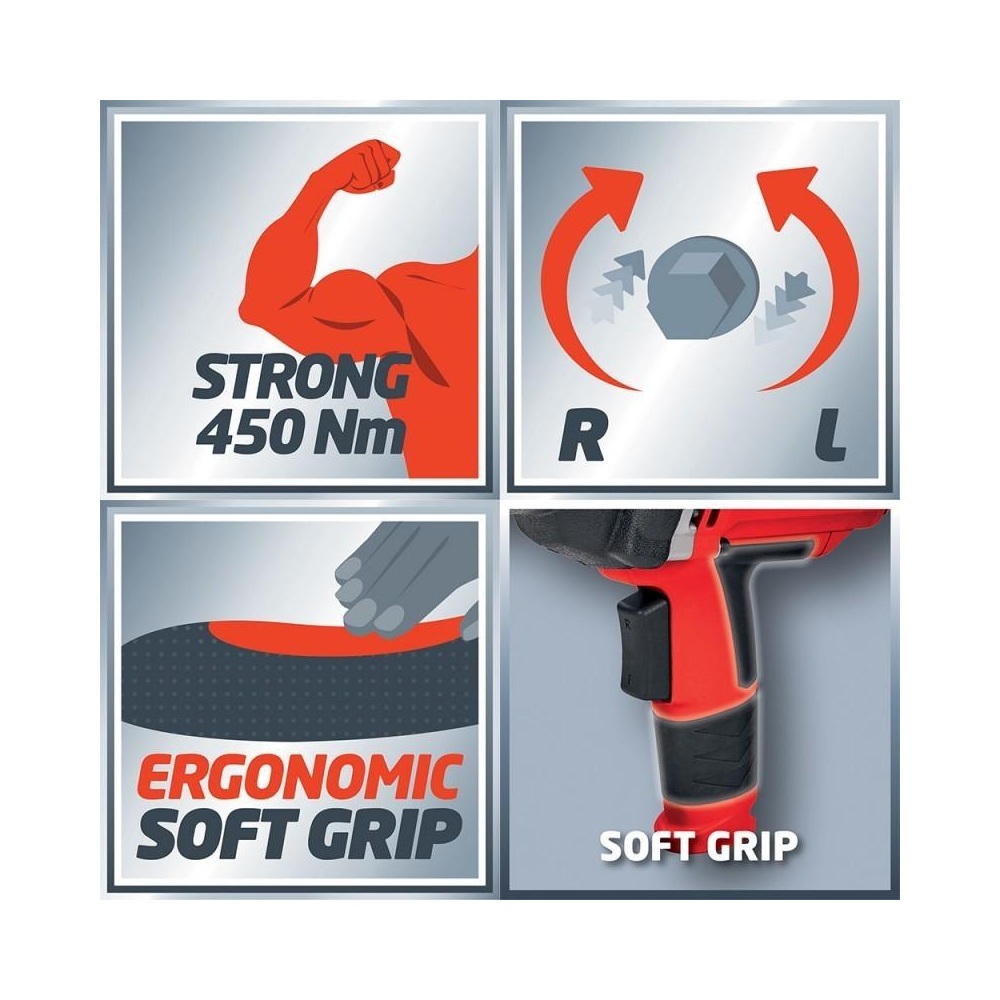 CC-IW 950 je praktičan i i snažan električni udarni odvijač za poslove mjenjanja guma bez napora i u vrlo kratkom roku. Udoban i siguran rad osiguran je radi mekane drške koja ne kliže iz ruke. Pregibni prekidač omogućuje brzu izmjenu smjera vrtnje, a robusno i snažno kućište, snažan motor od 950 W i zakretni moment od 450 Nm omogućuju da odradite raznovrsne zahtjevne poslove. Udarni odvijač dolazi zajedno s kompletom od 4 bita (17, 19, 21, 22 mm) i praktičnim transportnim koferom.