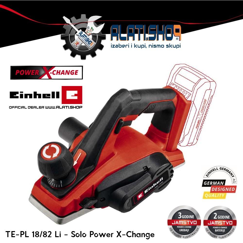 Akumulatorska blanjalica Einhell TE-PL 18/82 Li - Solo ima visoke performanse za „uradi sam“ i ambiciozne zaljubljenike u rad u drvetu koji ručno obavljaju poslove s dubinom struganja do 2 mm. Velika vratila noža daju optimalne rezultate blanjanja, a čvrsti aluminijski potplat osigurava ravne rezultate. Potplat također ima utor u obliku slova V za lako skretanje rubova. Postoji automatsko odmorište za parkiranje radi zaštite blanjalice i obratka. Ergonomska ručka osigurava čvrsto i sigurno držanje za neumoran rad. Za udobno rukovanje, bežična blanjalica ima meko držanje. Proizvod se isporučuje s paralelnom vodilicom za ravne i precizne rezultate blanjanja, kao i graničnikom dubine rbata za jednostavno izvođenje udubljenja. Također je uključen TCT nož za blanjanje (reverzibilna oštrica) za postizanje izvrsne kvalitete površine. Kao član visokokvalitetne obitelji Power-X-Change, sve se punjive baterije iz serije sustava mogu koristiti. Za optimalne rezultate preporučuje se korištenje punjivih baterija od 2,5 Ah ili više. Proizvod se isporučuje bez baterije i punjača koji su dostupni zasebno.