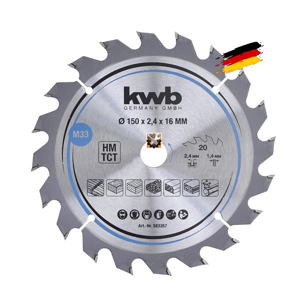 Vrh od volframovog karbida, brz, čist rez, pravilni zubi, za ručne kružne pile. Za masivno drvo, laminirane ploče (radne površine i radne ploče u kuhinji), ploče, iverice ili vlaknaste ploče i plastiku ojačanu staklenim vlaknima.