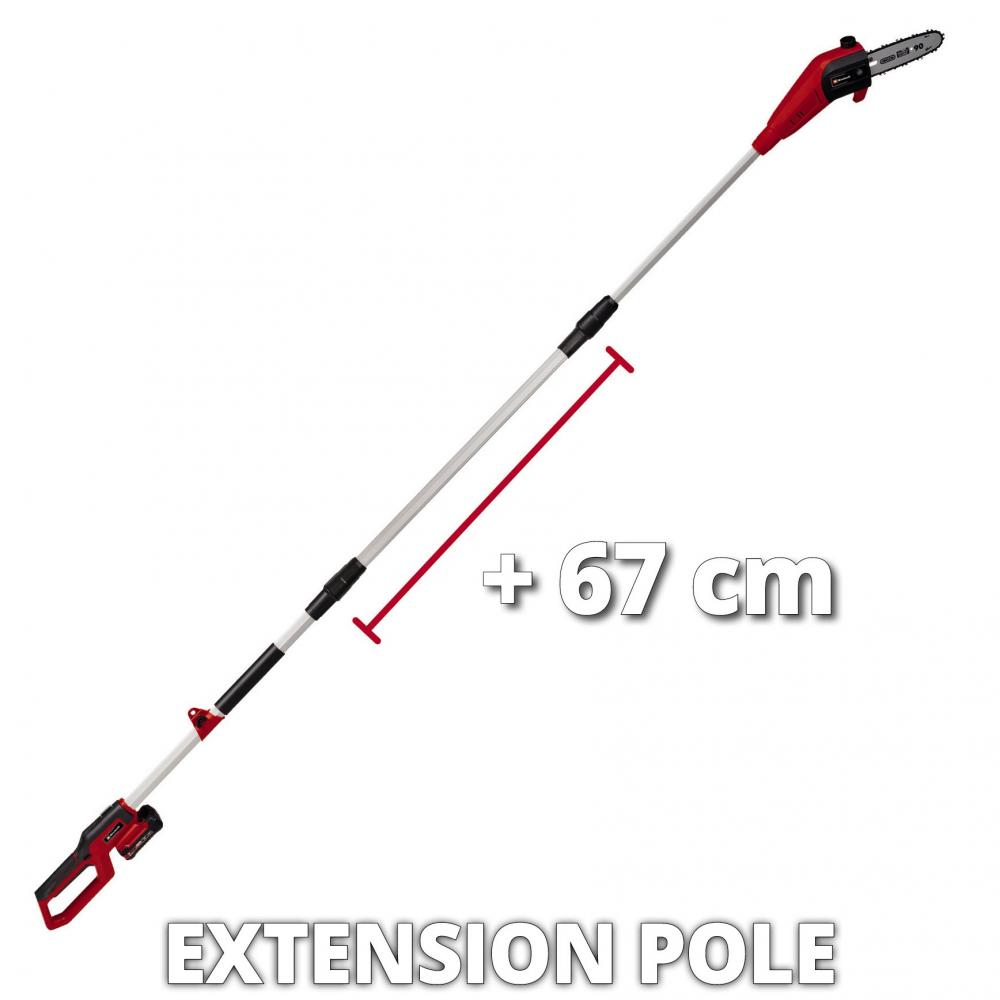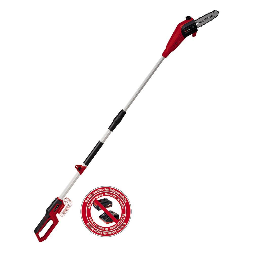 Einhell GC-LC 18/20 Li T-Solo akumulatorska teleskopska lančana pila idealna je za redovito orezivanje drveća i višeg grmlja. Član je obitelji Power X-Change. Ovaj proizvod dolazi bez baterije ili punjača koji su dostupni zasebno, npr. kao praktični starter setovi postavljen u različitim kapacitetima. S dužinom šine za rezanje od 200 mm (visokokvalitetna OREGON vodilica i lanac) i brzinom rezanja od 5,5 metara u sekundi, rezanje grana ne predstavlja problem. Glava motora ima kut nagiba od 30 °. Teleskopska drška pruža dosezanje viših grana. Dodatno gumirano područje za držanje osigurava ergonomsko rukovanje i sigurno držanje. Robusni metalni zupčanik dizajniran je tako da pruža duži vijek trajanja. Podmazivanje lanca je automatsko.