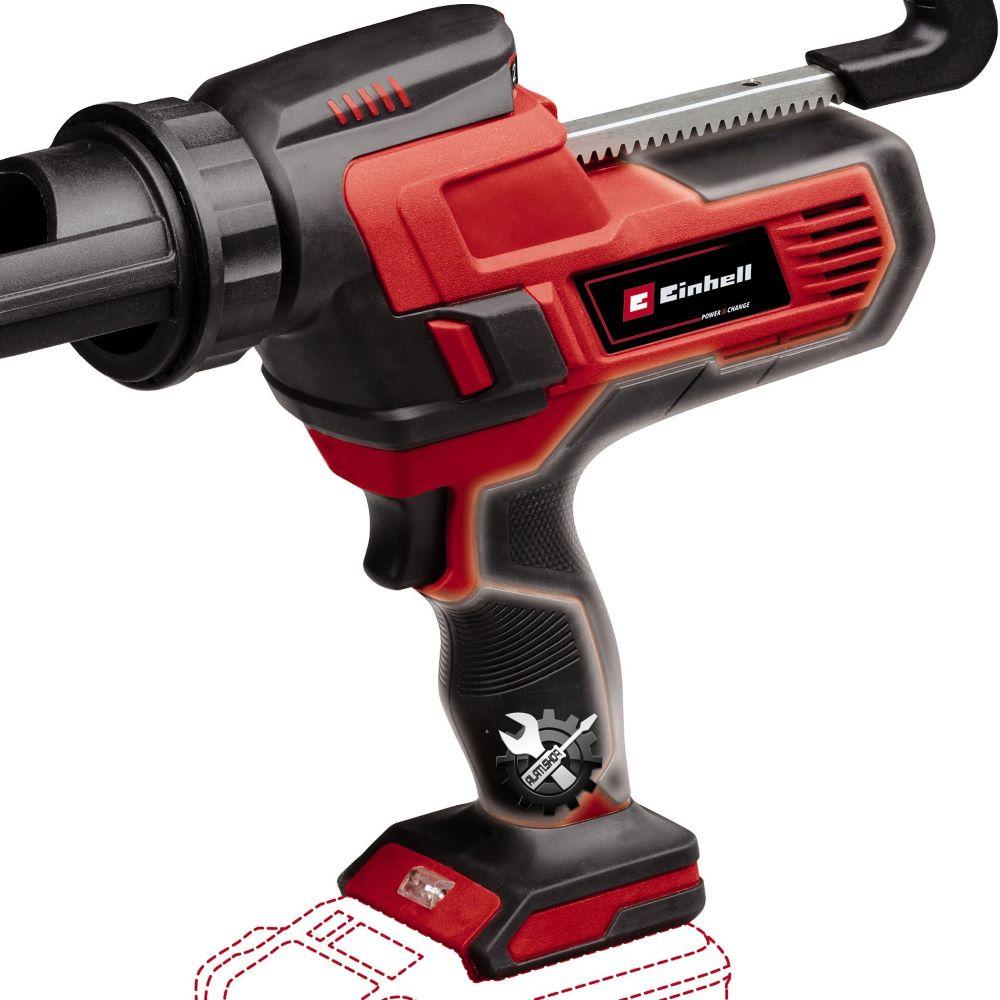 Einhell TE-SG 18/10 Li Solo bežični pištolj za brtvljenje idealan je dodatak osnovnoj zalihi alata u radionicama i DIY sobama, osobito kada ćete biti zauzeti redovitim popravcima ili većim poslovima restauracije i obnove. Ova tanki i praktični pištolj može se koristiti gdje god je potreban, ne samo zato što je član fleksibilne obitelji Power X-Change. Sve komercijalno dostupne patrone od 310 ml mogu se koristiti s ovim bežičnim pištoljem za brtvljenje. Izrađen je od robusnih materijala za izdržljivost čak i kada se redovito koristi u nepovoljnim uvjetima, a njegov mekani rukohvat osigurava čvrsto i sigurno držanje tijekom rada. Koristeći maksimalnu silu istiskivanja do 2000 N, ovaj pištolj za brtvljenje proizvodi ujednačen profil zahvaljujući regulatoru za podešavanje i tlačnoj sklopki za kontrolu brzine ispuštanja. Mogućnost individualnih prilagodbi omogućuje vam prilagođavanje brzine različitim materijalima i količinama koje su potrebne zavisno od posla do posla. Mehanizam za povratni korak sprječava kapanje i lijepljenje materijala na površine na kojima odlažete pištolj. Sjajno LED svjetlo osigurava optimalnu vidljivost radnih područja čak i u slabom svjetlu. Ovaj proizvod dolazi bez baterije i punjača iz serije Power X-Change; ove stavke su dostupne odvojeno, npr. kao praktičan starter set.