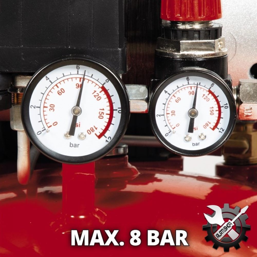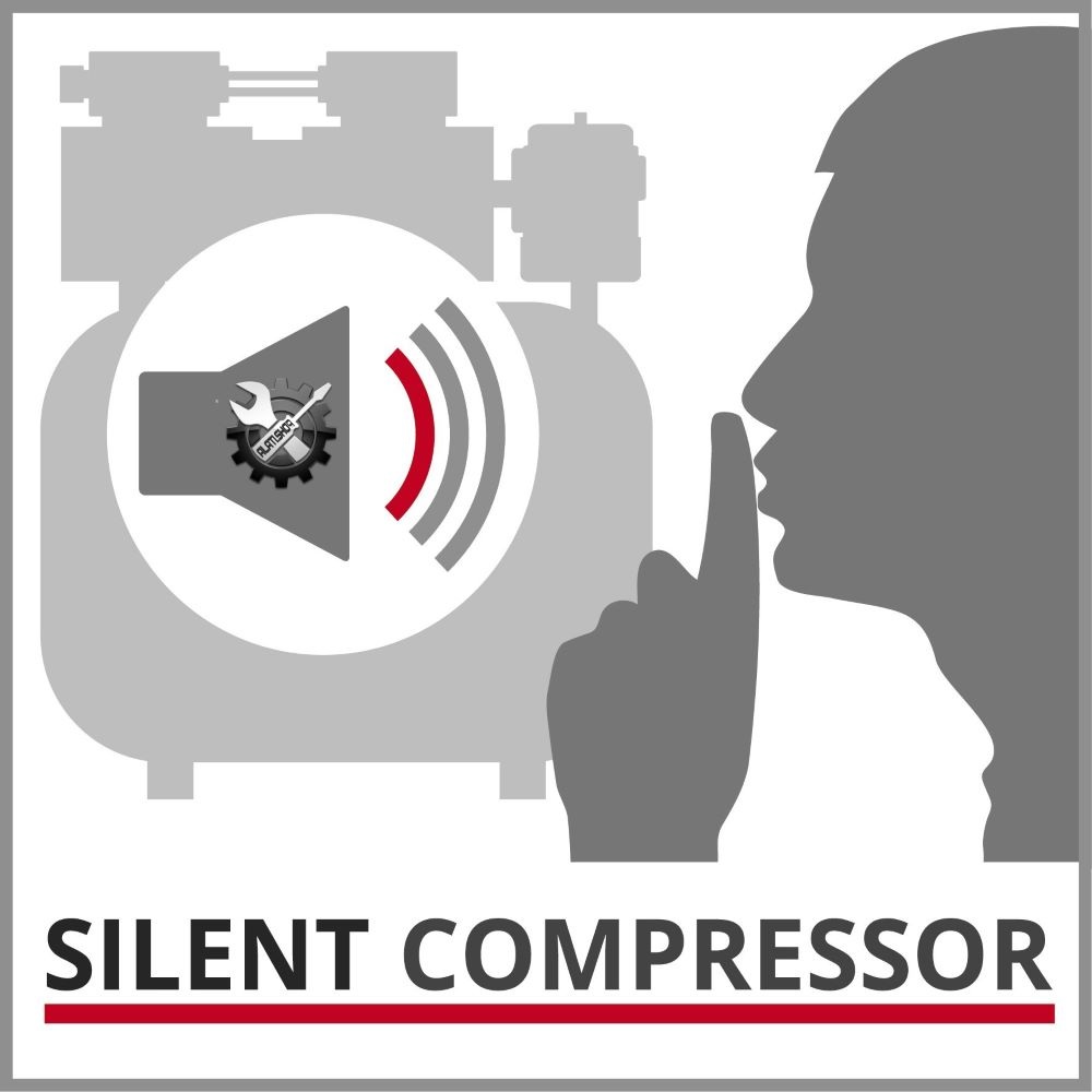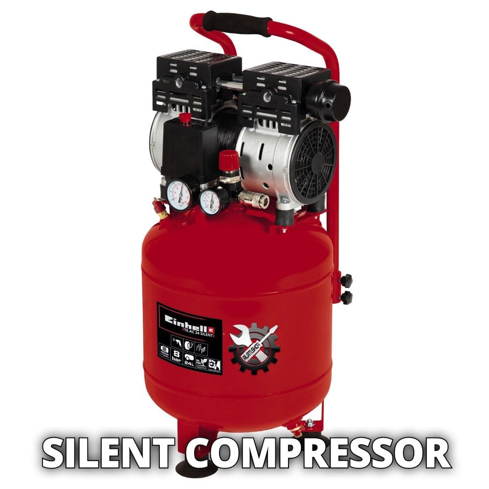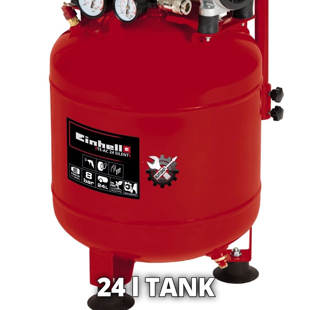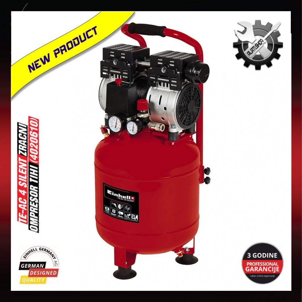 Einhell TE-AC 24 Silent kompresor, multifunkcionalni osnovni uređaj pronalazi svoj put u garažu ili radionicu. Kompresor karakterizira niža razina buke od 57dB (LpA) – tihi kompresor koji sa 750 wata ne radi nikakve kompromise u performansama. Kompresor je znatno tiši od konvencionalnih kompresora s istim učinkom, a pokreće ga pumpa bez ulja. Odvodni vijak omogućuje jednostavno održavanje kompresora. Spremnik od 24 l nudi dovoljne rezerve zraka za nanošenje laka i boje u kratkom roku s pravim alatima ili za impregniranje velikih površina ili ciljanog drveta uljem. Radovi na ispuhivanju ili pjeskarenju također se mogu obaviti u radionici. Svestrani pomoćnik bez napora napuhava automobilske, motociklističke i biciklističke gume, lopte ili zračne madrace. Einhell je uvjeren u kvalitetu i nudi desetogodišnje jamstvo protiv hrđe spremnika. Brojne primjene do 8 bara mogu se regulirati pomoću regulatora tlaka. Uključeni su manometar i brza spojka za regulirani radni tlak kao i drugi manometar za tlak spremnika. Sigurnosni ventil osigurava sigurnost korisnika. Kompresor se može lako transportirati u nekoliko jednostavnih koraka, noge koje prigušuju vibracije osiguravaju sigurno uporište. Stojeći dizajn omogućuje pohranu koja štedi prostor.