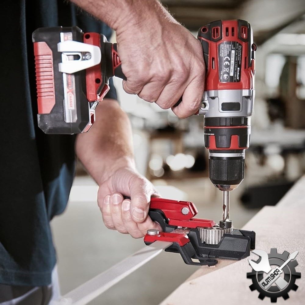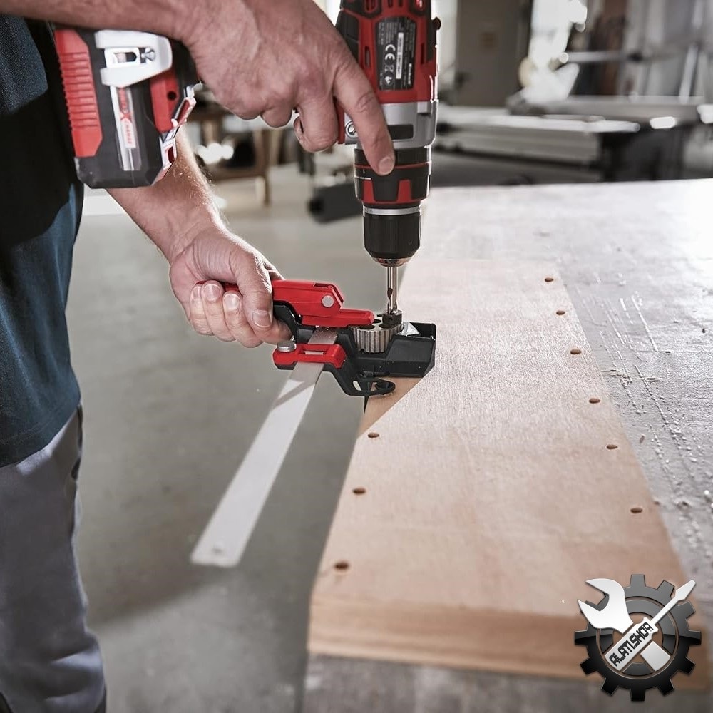 Patentirana vodilica za tiple i svrdla s paralelnim graničnikom i pločom za bušenje za sve uobičajene tiple promjera 6 mm, 8 mm i 10 mm za stvaranje kutnih, površinskih ili sučeonih spojeva. Može se koristiti kao vodilica za svrdla duljine između 3 mm i 12 mm za precizno bušenje pod 90°. Posebno pogodan za glatke i osjetljive drvene površine zbog gumene protuklizne zaštite. Prikladno i za bušenje metala ili kamena. S ravnalom od 30 cm i dodatnom pločom za bušenje rupa za serijsko bušenje.