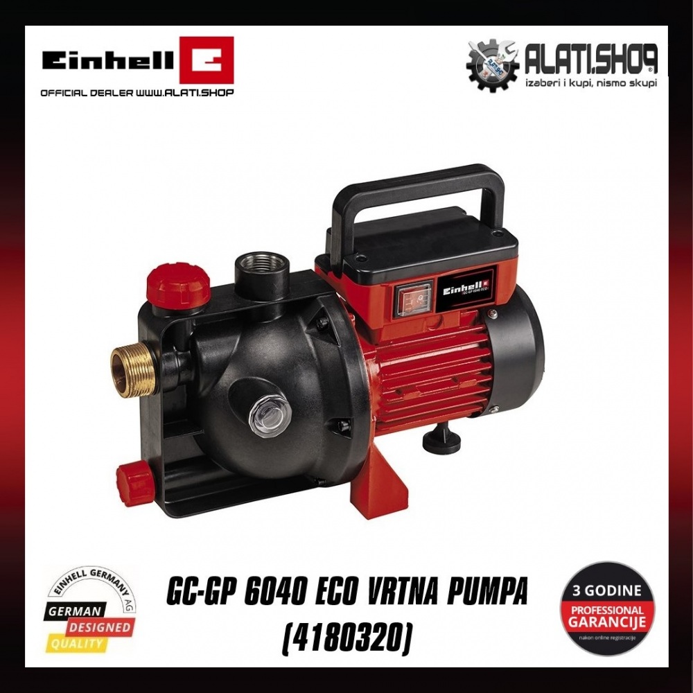 Einhell vrtna pumpa GC-GP 6040 ECO je visokokvalitetan i moćan uređaj koji dobro služi ambicioznim hobi vrtlarima pri zalijevanju vrtova. S Einhell ECO Power tehnologijom, crpka postiže visoku stopu isporuke uz relativno nisku potrošnju energije. S motorom od 600 W, vrtna pumpa pumpa do 4000 litara čiste vode svakog sata s dubine do 8 metara. Toplinska zaštita od preopterećenja štiti crpku od oštećenja uzrokovanih pregrijavanjem.